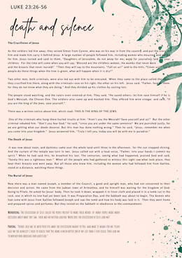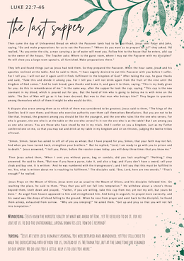 Each reading is displayed around the church building which is open from Monday 14th April to Good Friday 18th April (12-2pm) as well as Monday to Wednesday evenings, 7-8.30pm. There you can take your time to read, sit and pray. Following each reading there are one or two reflective questions and a prayer.